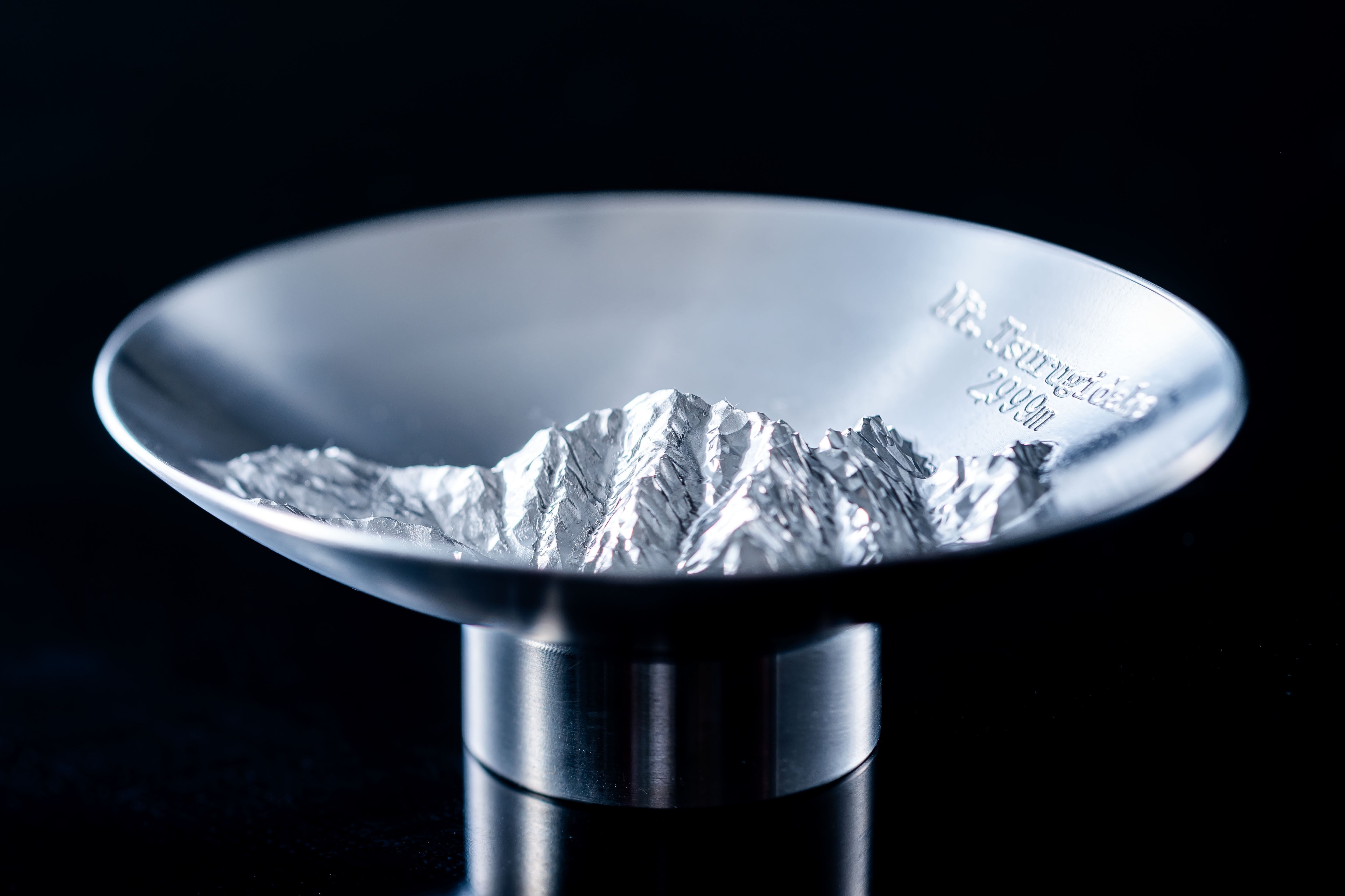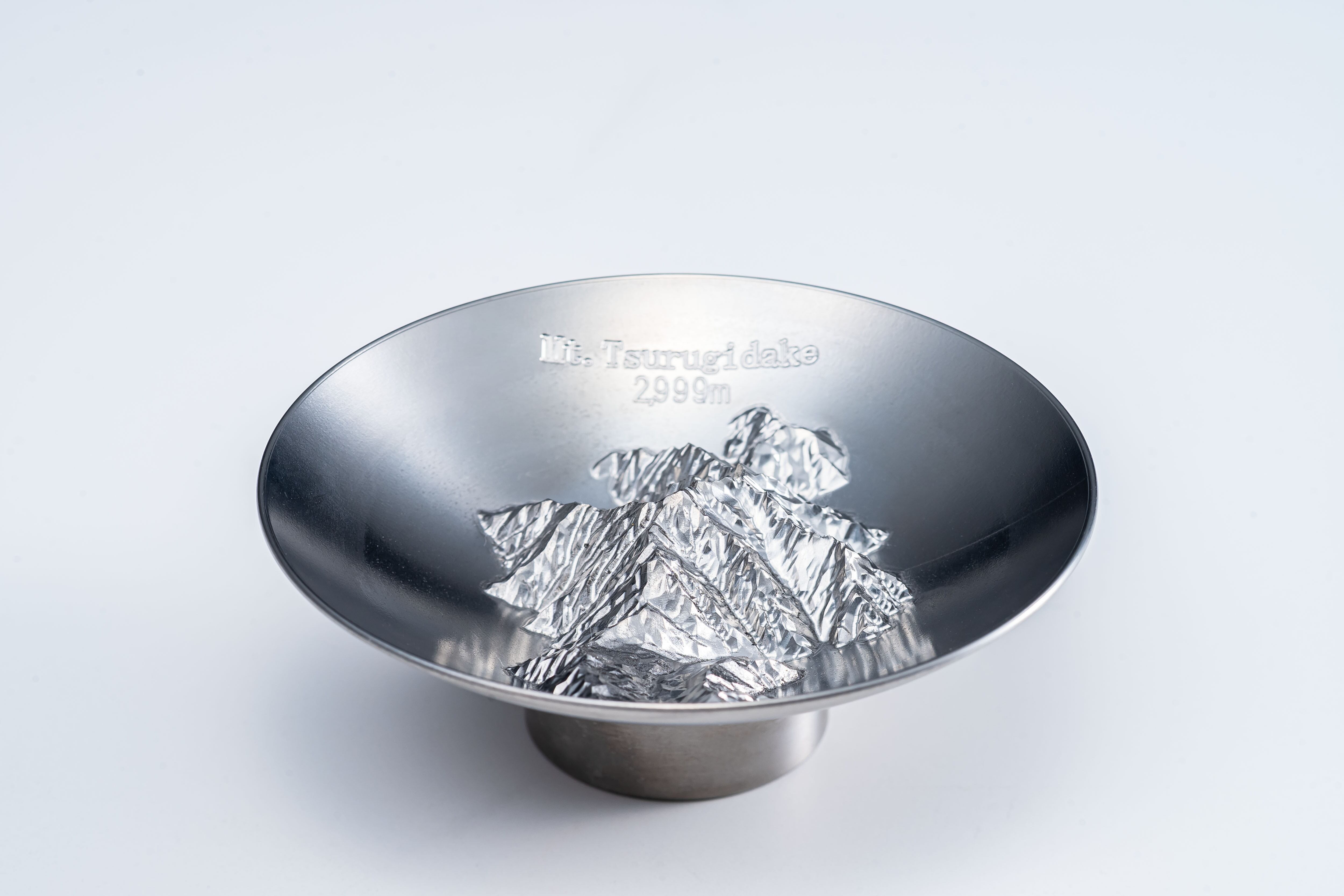 岩の殿堂と称される荒々しい岩肌と、天を劈くような峻烈な山容を、国土地理院の3Dデータを基に驚異の精度で杯の底に再現しました。